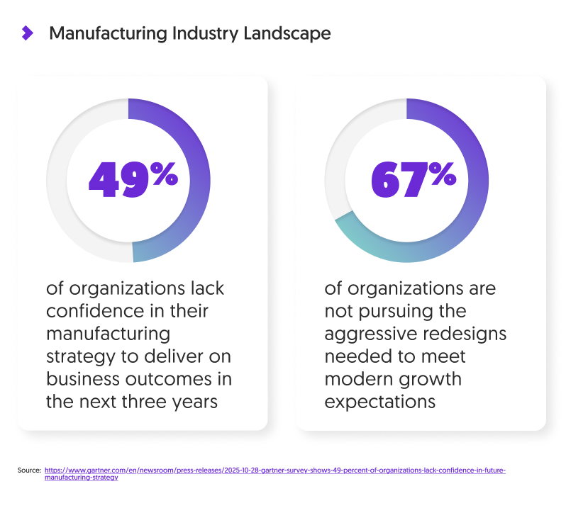 According to a 2025 Gartner survey, 49% of organizations lack confidence in their manufacturing strategy to deliver on business outcomes in the next three years, and two-thirds are not pursuing the aggressive redesigns needed to meet modern growth expectations.